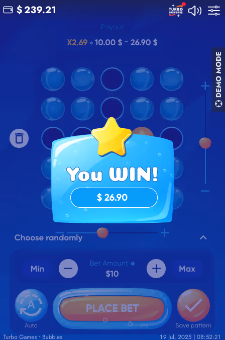 Bubbles is a very simple Mines game which we believe will only appeal to a certain kind of player. It's a very casual game and probably not one that hardcore gamblers would choose on the regular. Although the game grid has more customization than most Mines games, the max multiplier is significantly less than its competitors due to the static 1x mine hidden on the grid each round. Play the demo game for free at the top of this page!