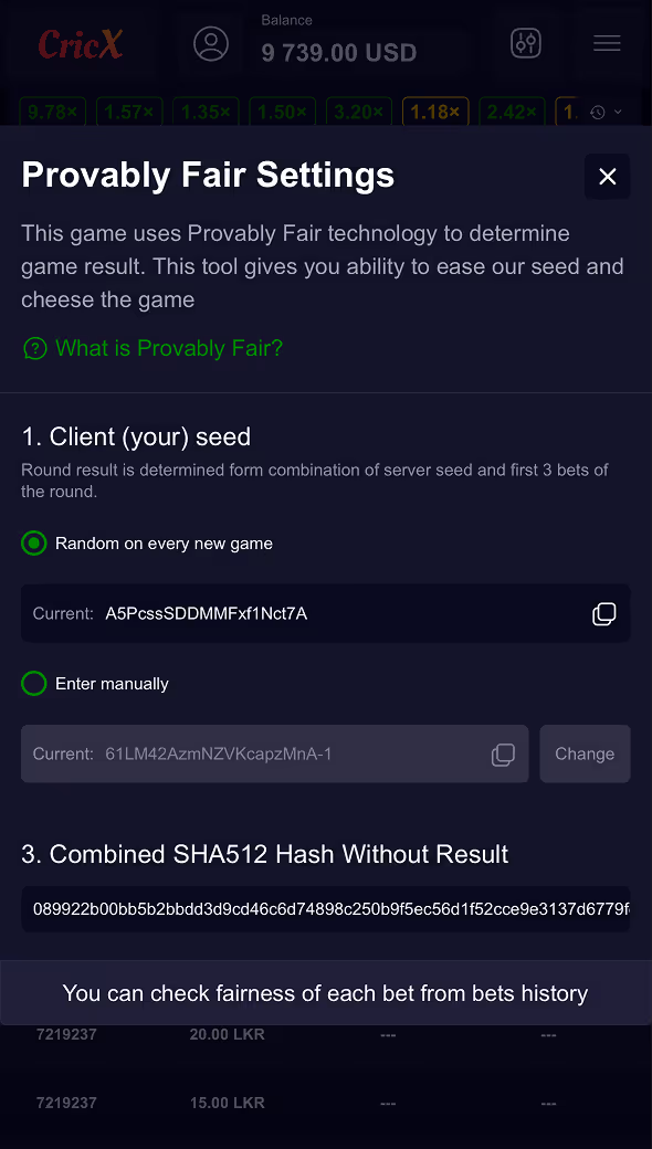 Provably Fair Settings - Check the legitimacy of each round from the Provably Fair settings panel.