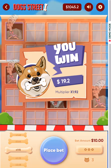 Dogs Street from Turbo Games is an animal themed mines game, where your goal is to find as many dogs as possible without revealing any crazy cat ladies. Find all the dogs without seeing a cat to win the maximum multiplier of 456,660x! Play the demo game for free below.