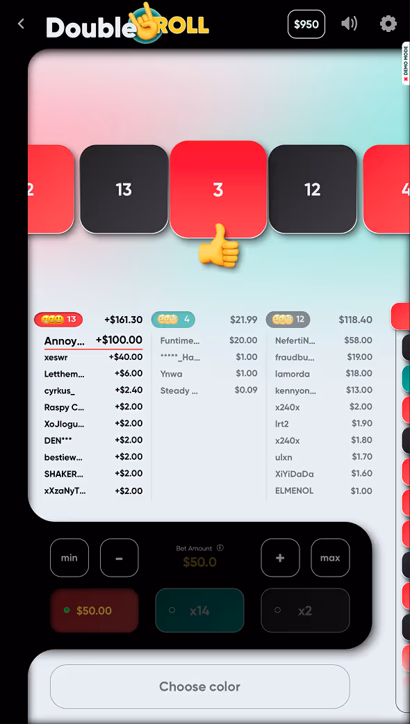 Double Roll is a simple Roulette themed game with basic betting options. There's only 15 segments on the wheel with the Green segment awarding the max win of 14x. If you’re familiar with Roulette then you will understand very quickly how this works, however anyone can jump in and pick up this game's mechanics very easily. The real take away feature of this game is the fun multiplayer lobby where you can track other players bets. Try the free demo game for yourself at the top of this page!