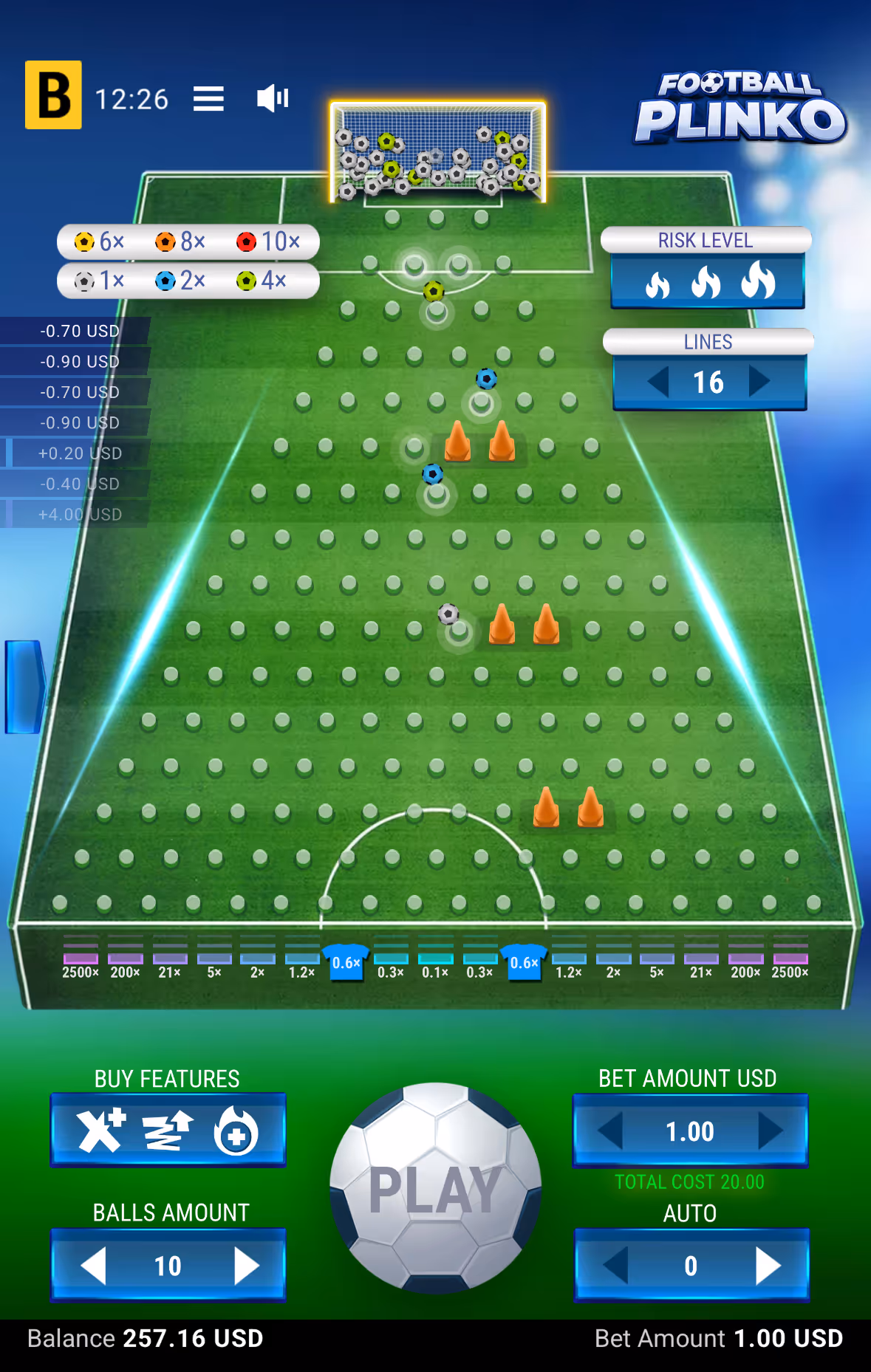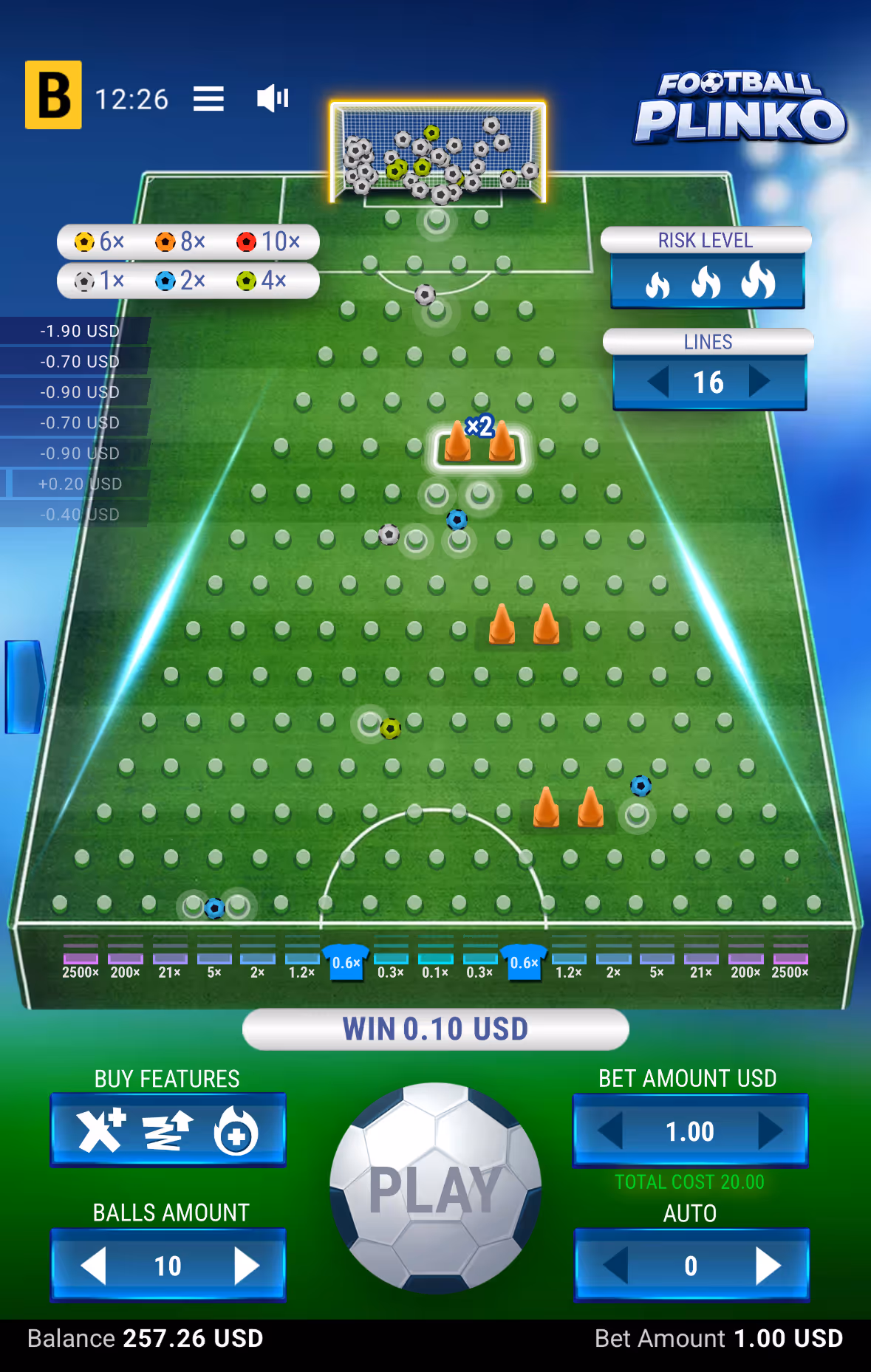 Multipliers: When it is activated, some stretch lines appear on the field. If a ball goes through these stretch lines, it gets an additional multiplier that is applied to the win amount. A player can slightly move stretch lines within the playing field.
