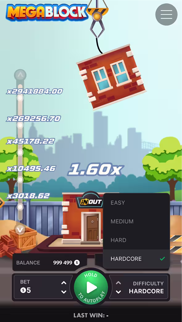 “MegaBlock is built around tension. Floors swing above the tower, waiting for the perfect moment to drop. Choose your difficulty, watch the multiplier grow in real time, and decide when to lock in the result. The higher the tower climbs, the stronger the anticipation. Clean design. Clear progression. A format that keeps you coming back.” - InOut Games