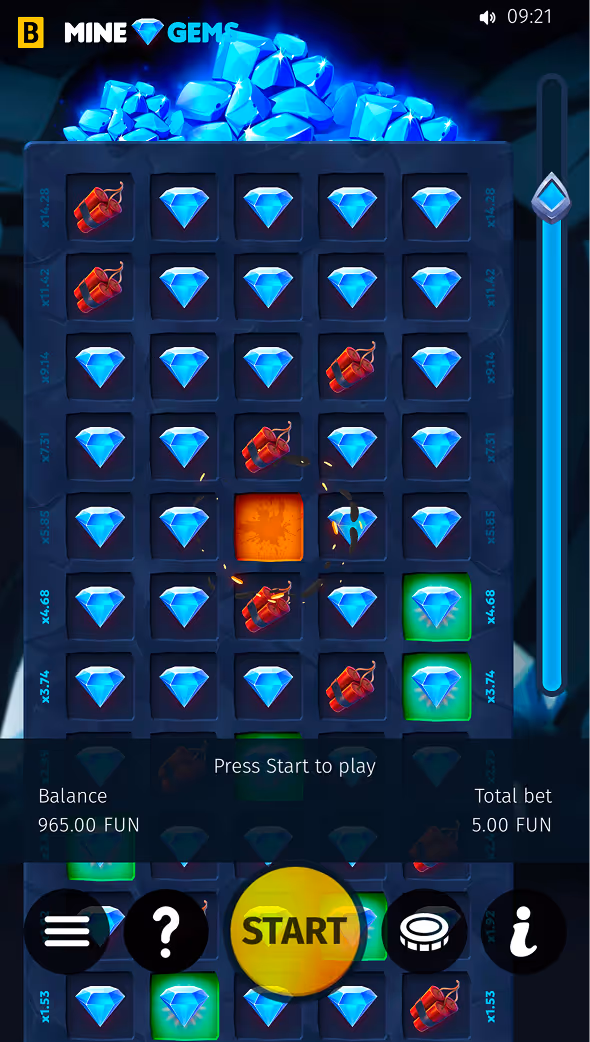 The field size is 5x12. Each row contains one dynamite and 4 diamonds. Select your bet in the Total Bet field. To place your bet press ‘Start’. Click on any square to take your first step on the game page. If you land on a safe spot, you win. Payouts are given beside each row and multiplied by the total bet.