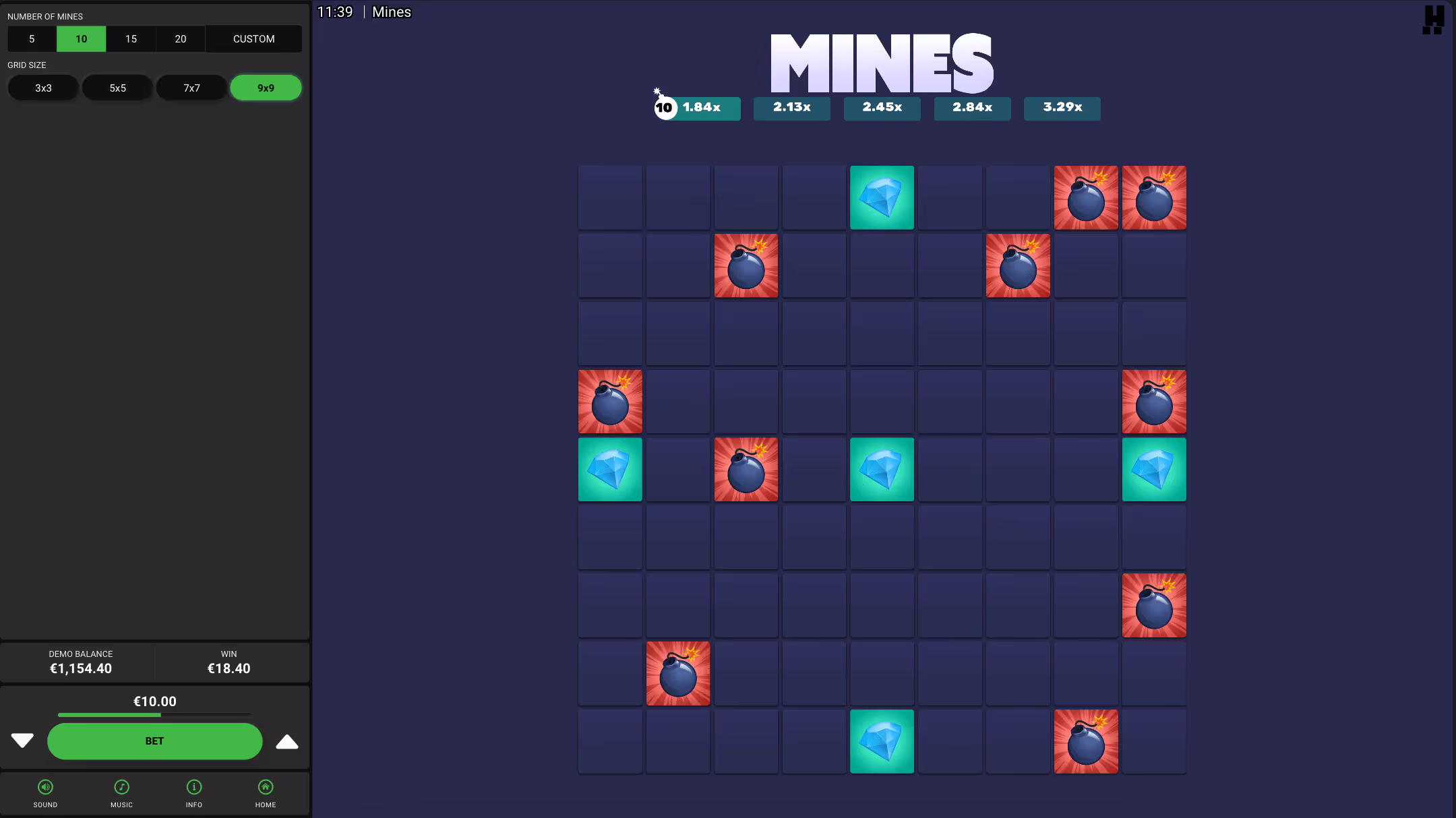Before placing the bet, you should configure the game by choosing the size of the grid and how many Mines should be present on the grid. A larger number of Mines increases the risk, and the payout, while a larger grid makes avoiding Mines easier, but the payout per Diamond goes down.