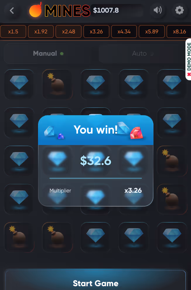 Once the bet value and the number of bombs is locked in, players can place a bet on either manual or automatic mode. If the player reveals a blue gem, they may either cashout or risk picking another tile. For every blue gem revealed, the win multiplier increases.
