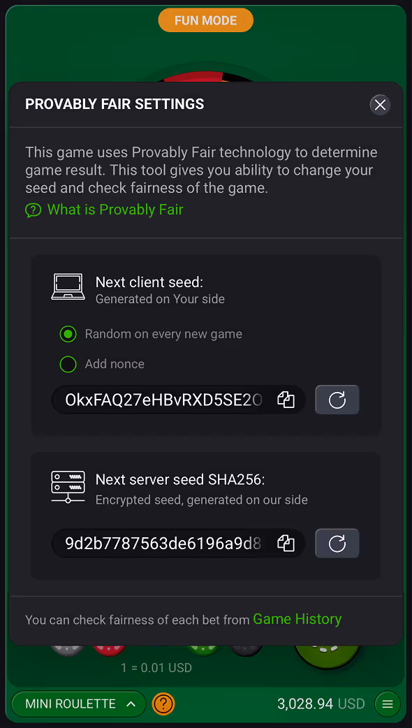 Provably Fair Technology: Check the legitimacy of round results in the round history with the Provably Fair Settings panel.