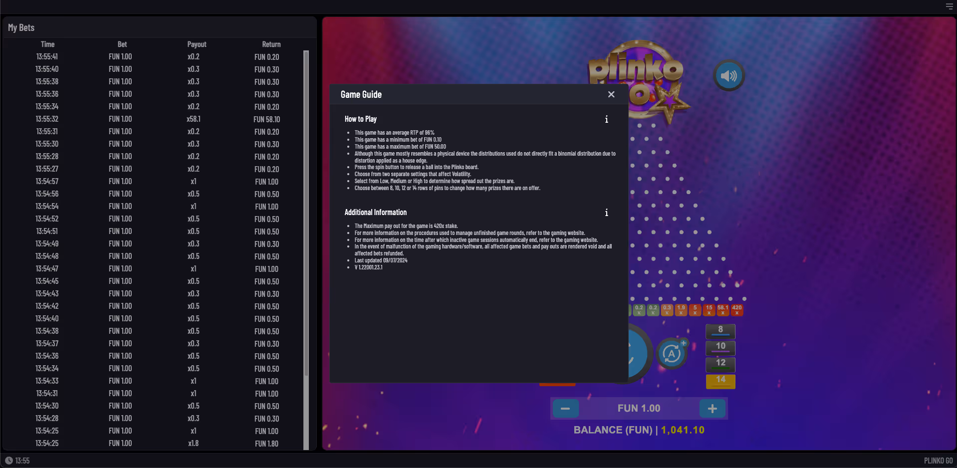 Plinko Go is your stock standard Plinko game, nothing new or fancy but still has everything you need from Plinko. It's not as customizable as others with the same functionality, for example you can only configure the game page to have either 8, 10, 12 or 14 rows where some other games will offer every denomination between. Still, we found it to play very smooth and the graphics are clean and easy to watch. Play the free demo game at the top of this page!