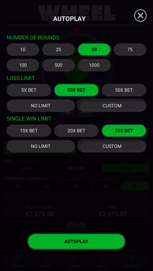 Autoplay: Wheel Dare2Win has a strategic autoplay feature where you can not only automate wheel spins, but also loss and win triggers to stop the autoplay.
